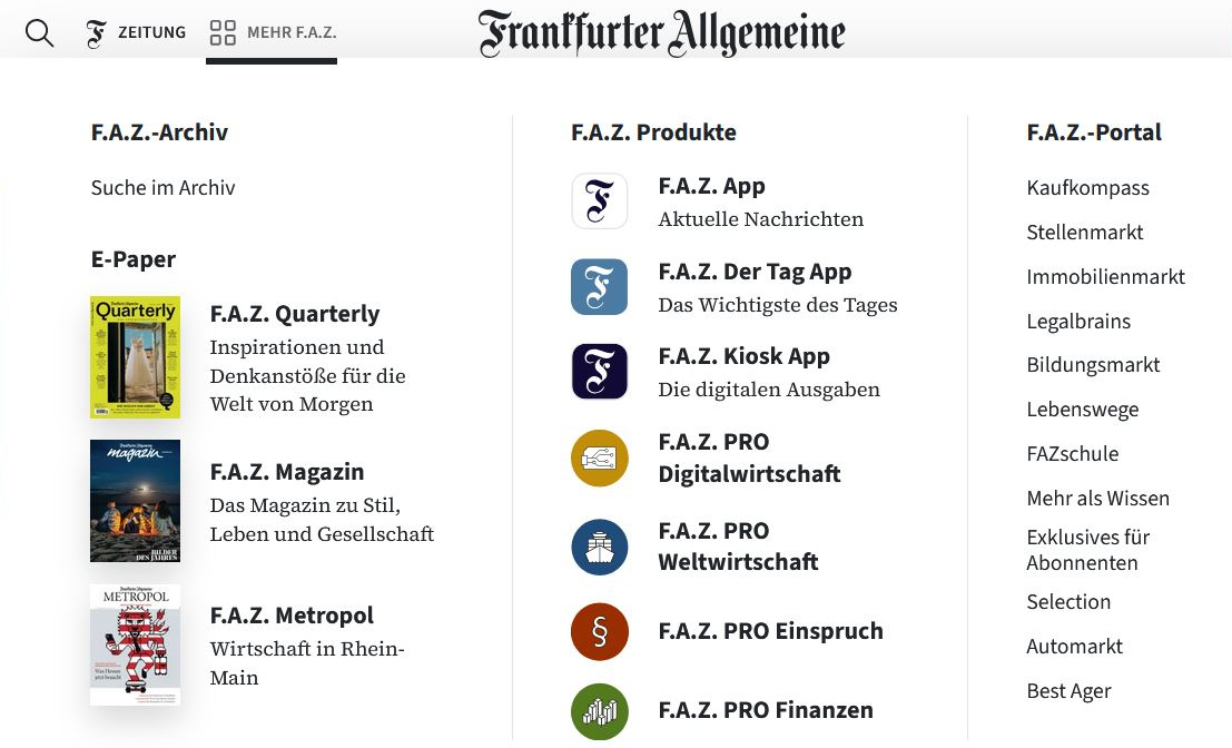 Übersicht über das Angebot der Tageszeitung FAZ im Bereich digitaler Kanäle.